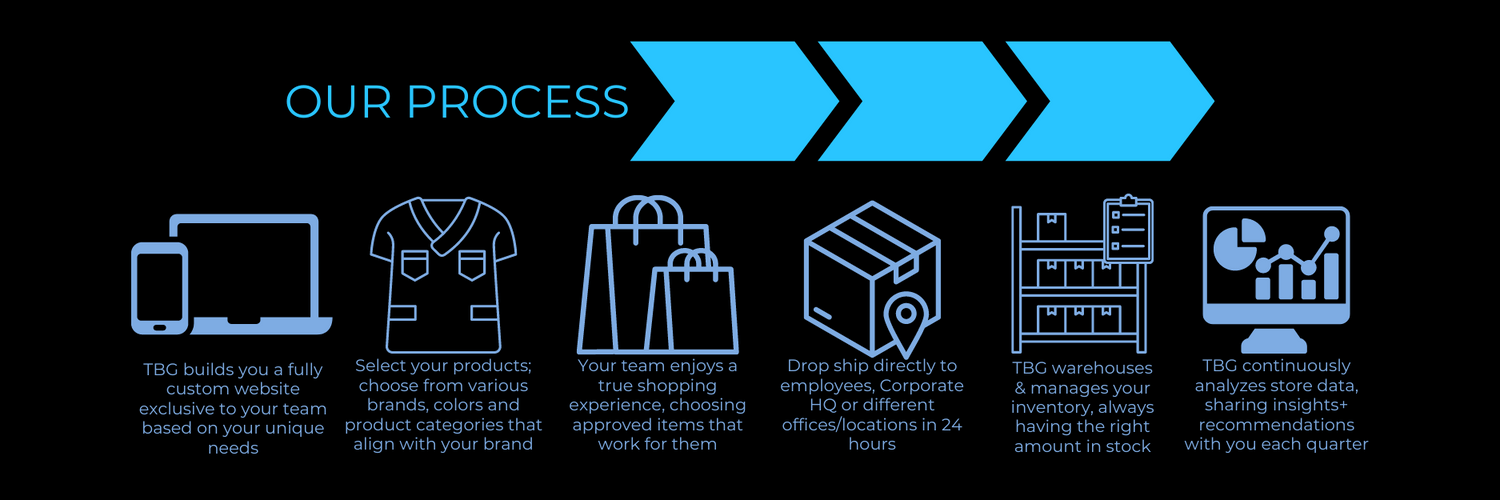 No more wasted time spent on managing inventory, getting team orders together or looking for a local embroiderer to put your logo on your favorite scrubs. Instead, we do it all for you and provide solutions for your entire team throughout the process.